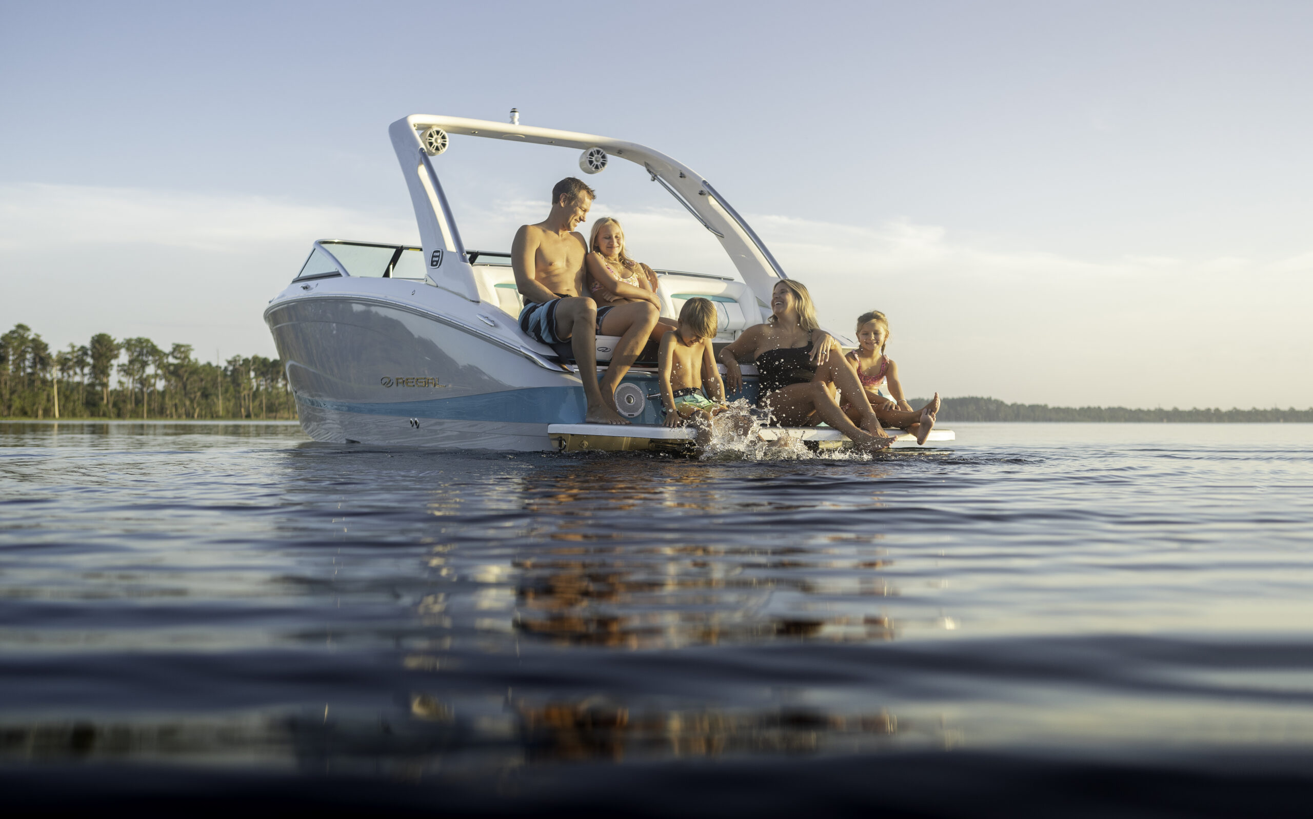Mit einer praktischen, tief im Wasser liegenden Badeplattform, großzügigen Raumangeboten und einer durchdachten Ergonomie sind die Sterndrive Bowrider von Regal perfekt für Familien und eignet sich hervorragend für Wassersport-Aktivitäten aller Art.