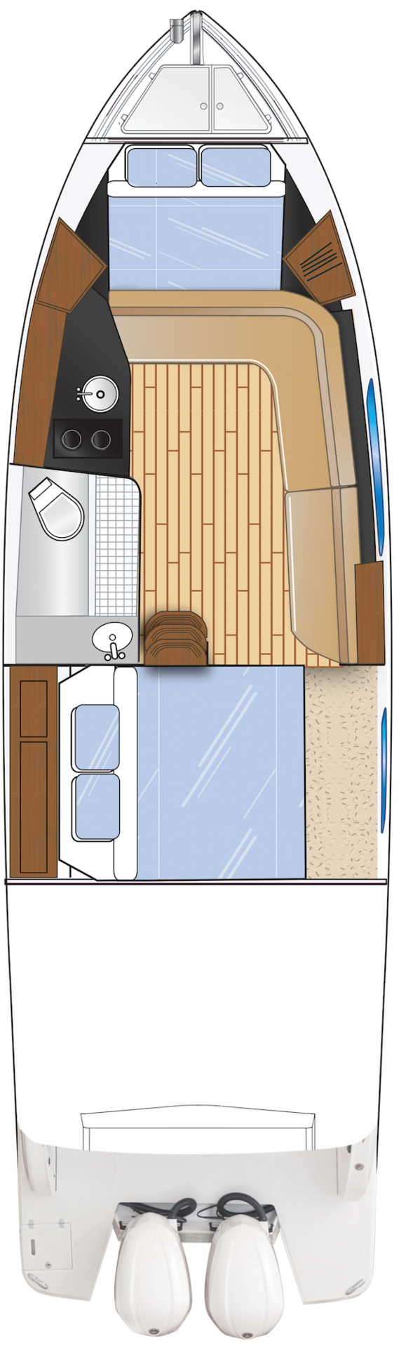 Nutzen Sie den Raumvorteil der Außenborder-Konstruktion. Der riesige Lazarette-Bereich stellt sicher, dass Sie für jede Ausfahrt bestens gerüstet sind. Hier findet sperriges Equipment ebenso sicher seinen Platz wie das Reisegepäck.