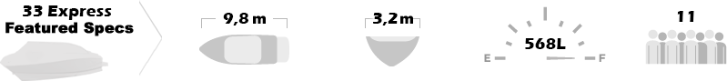 Genießen Sie luxuriösen Komfort auf dem Deck und gönnen Sie sich die erstklassigen Annehmlichkeiten, die Sie unten in der geräumigen Kabine finden. Mutig und prestigeträchtig, dies macht die 33 Express zu einem guten Gesprächsthema.